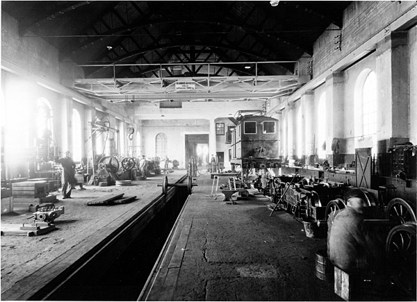 Jernbaneverkstedet på Thamshavn. Et av Westinghouselokene er inne til revisjon.
